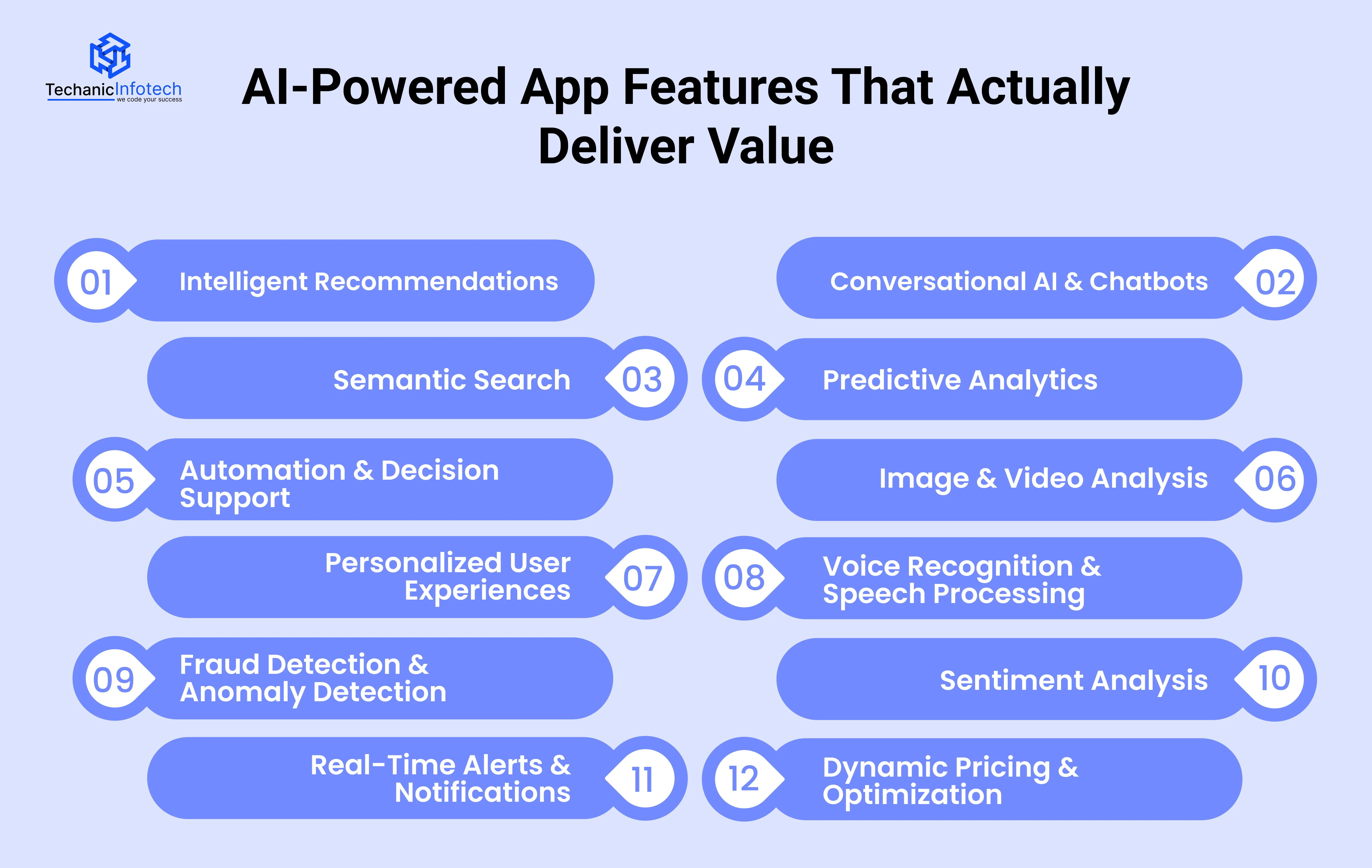 Below are AI-powered app features commonly used in high-performing AI applications today: