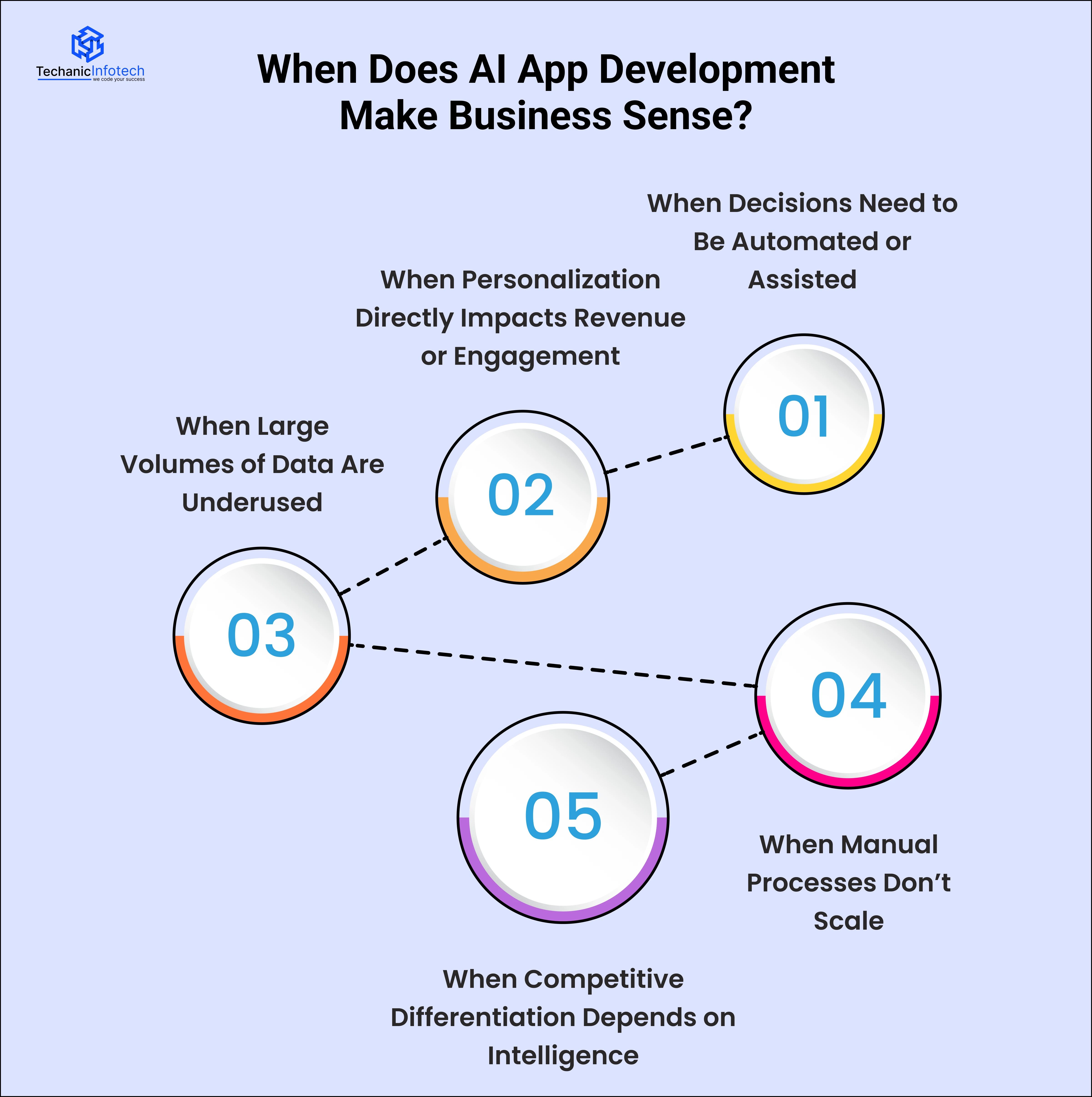 Custom AI app development makes more sense when AI is central to your product, requires deep customization, or involves proprietary data or long-term competitive differentiation.