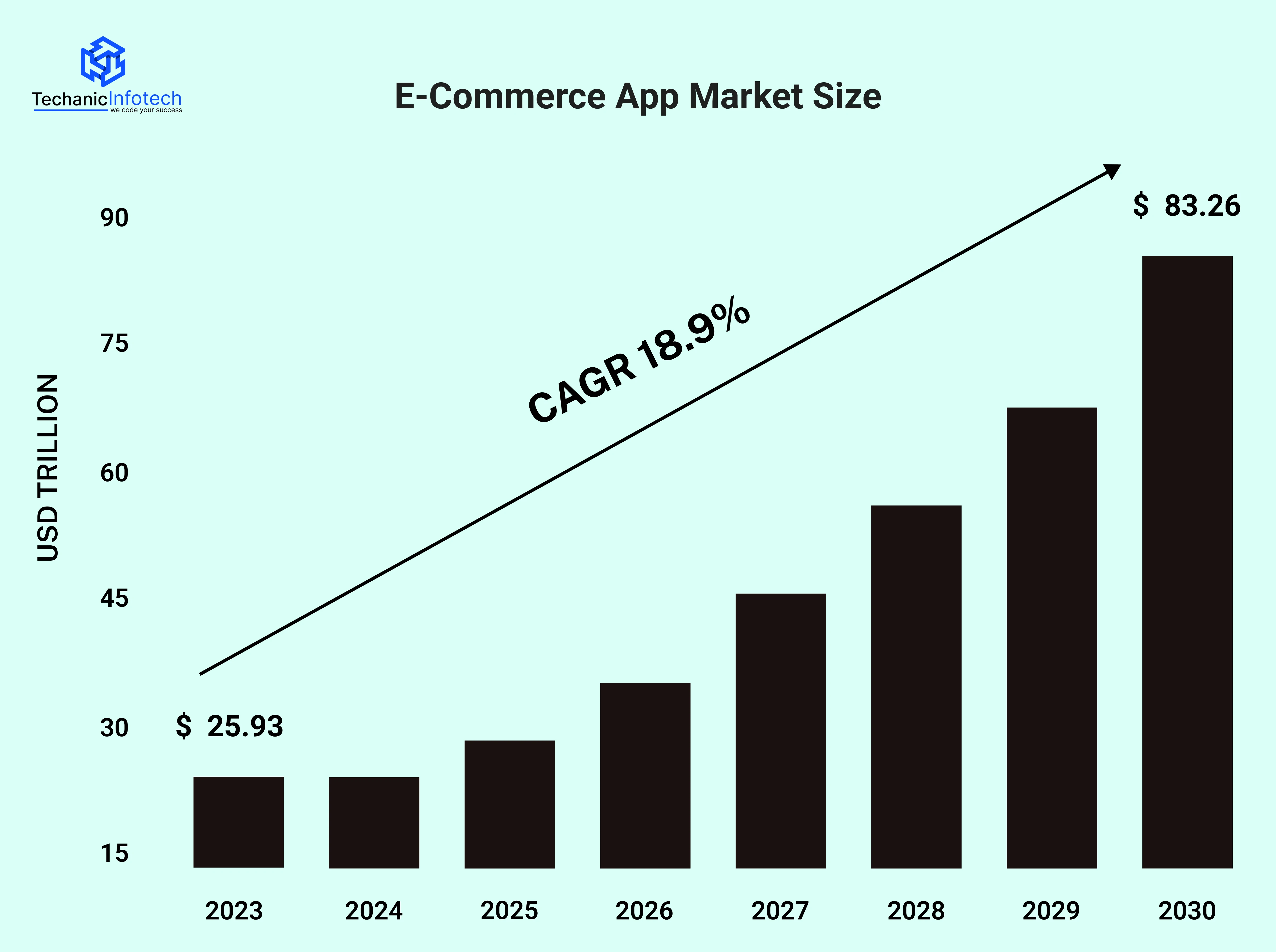 The global e-commerce market was valued at USD 25.93 trillion in 2023 and is expected to grow to USD 83.26 trillion by 2030, representing a compound annual growth rate (CAGR) of 18.9% from 2024 to 2030.