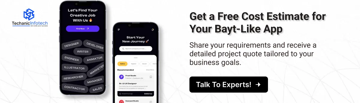 Your final Bayt-like app development cost will depend on your app’s complexity, number of features, design quality, and long-term scalability.