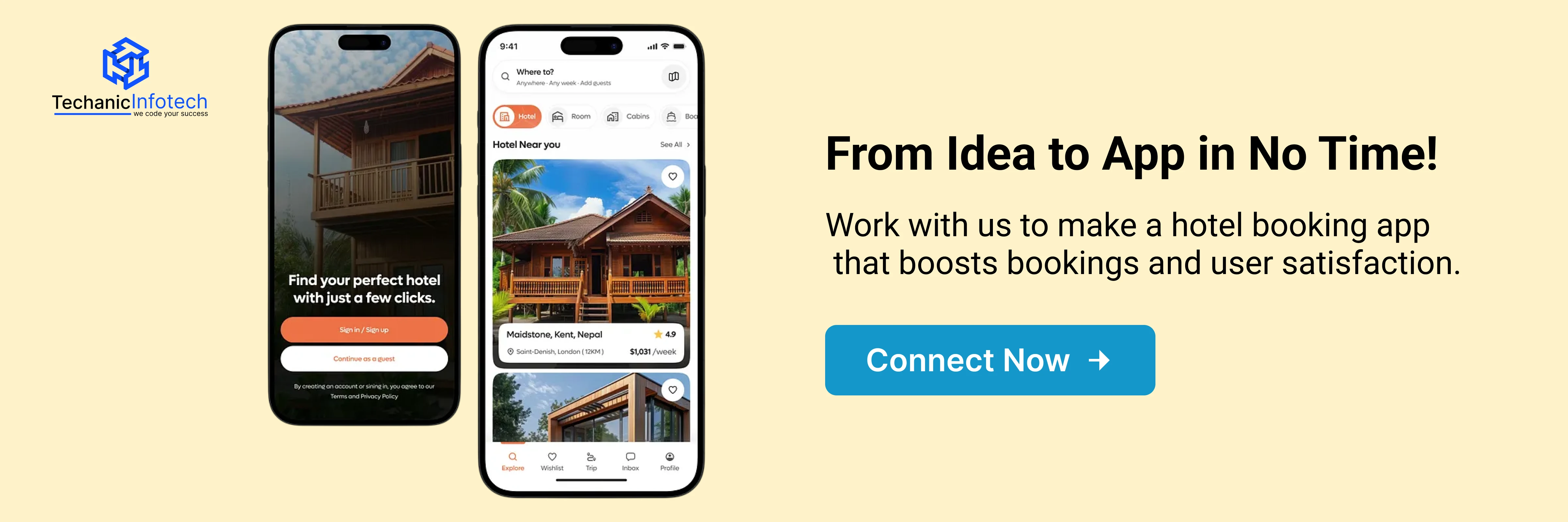 Partner with Techanic Infotech to bring your vision to life, and build a hotel booking app that stands out in today’s competitive market.
