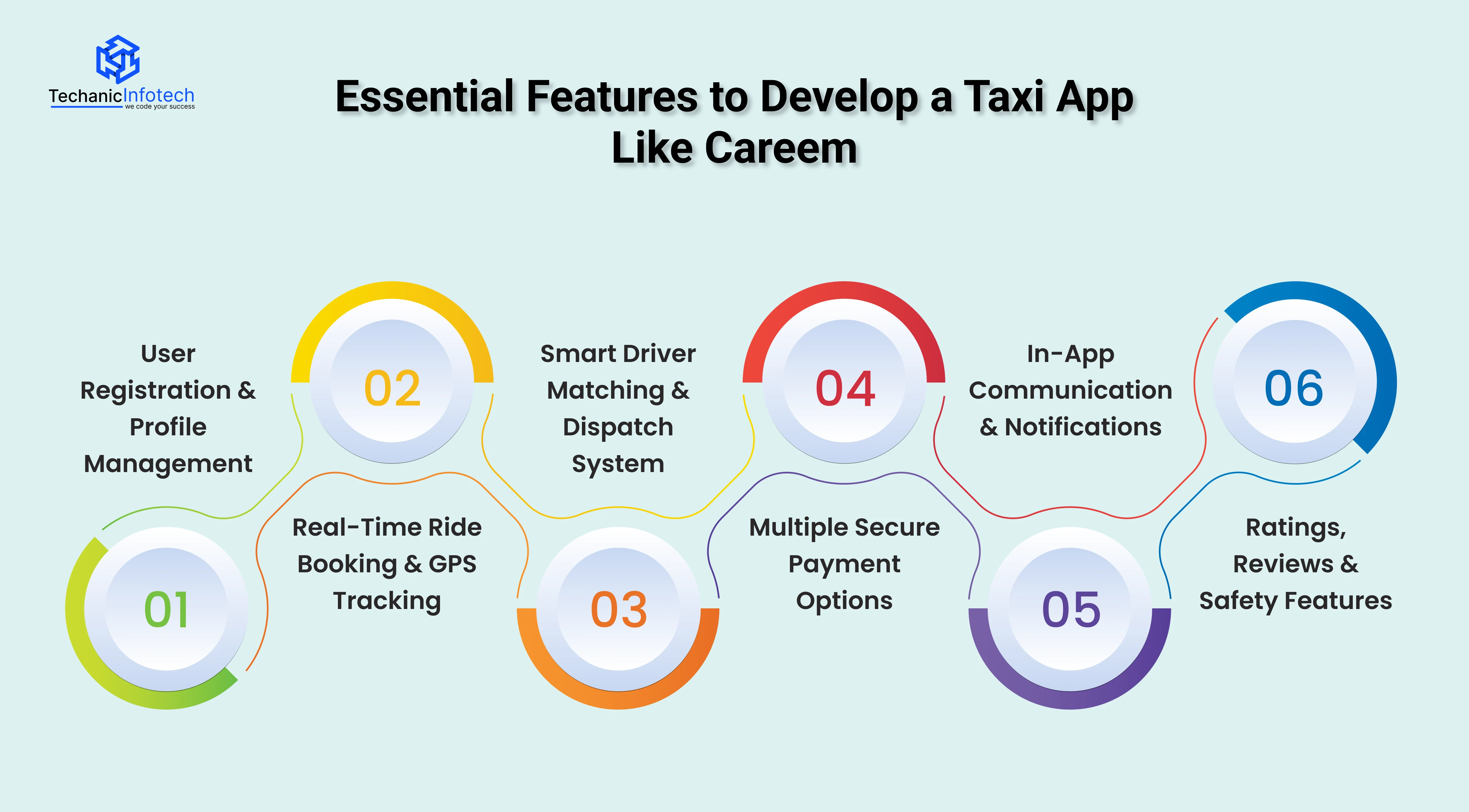 This includes ride booking, real-time tracking, secure payments, driver verification, and safety tools.
