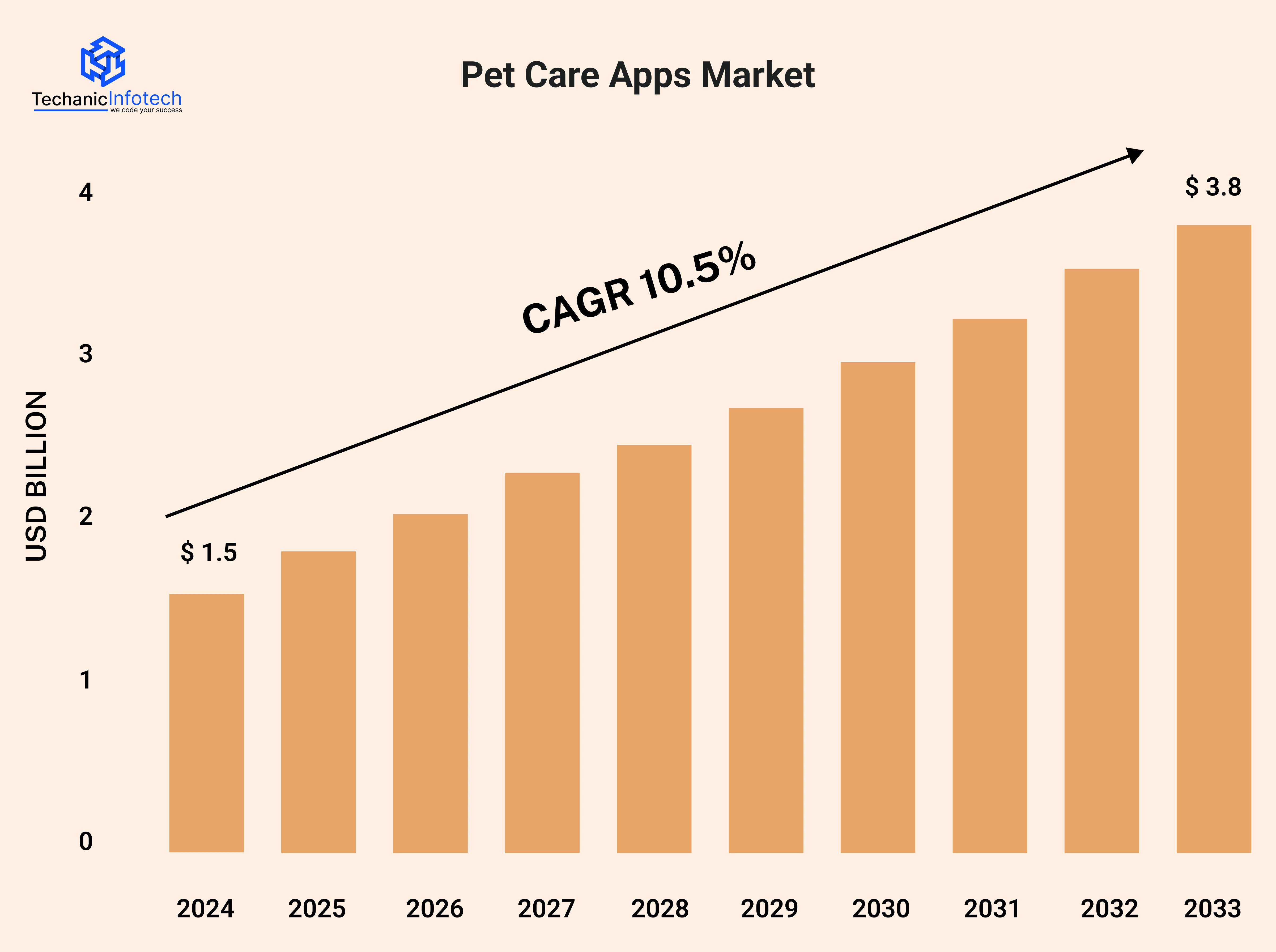 The pet care apps market was USD 1.5B in 2024 and is expected to reach USD 3.8B by 2033, with a 10.5% CAGR (2026–2033).