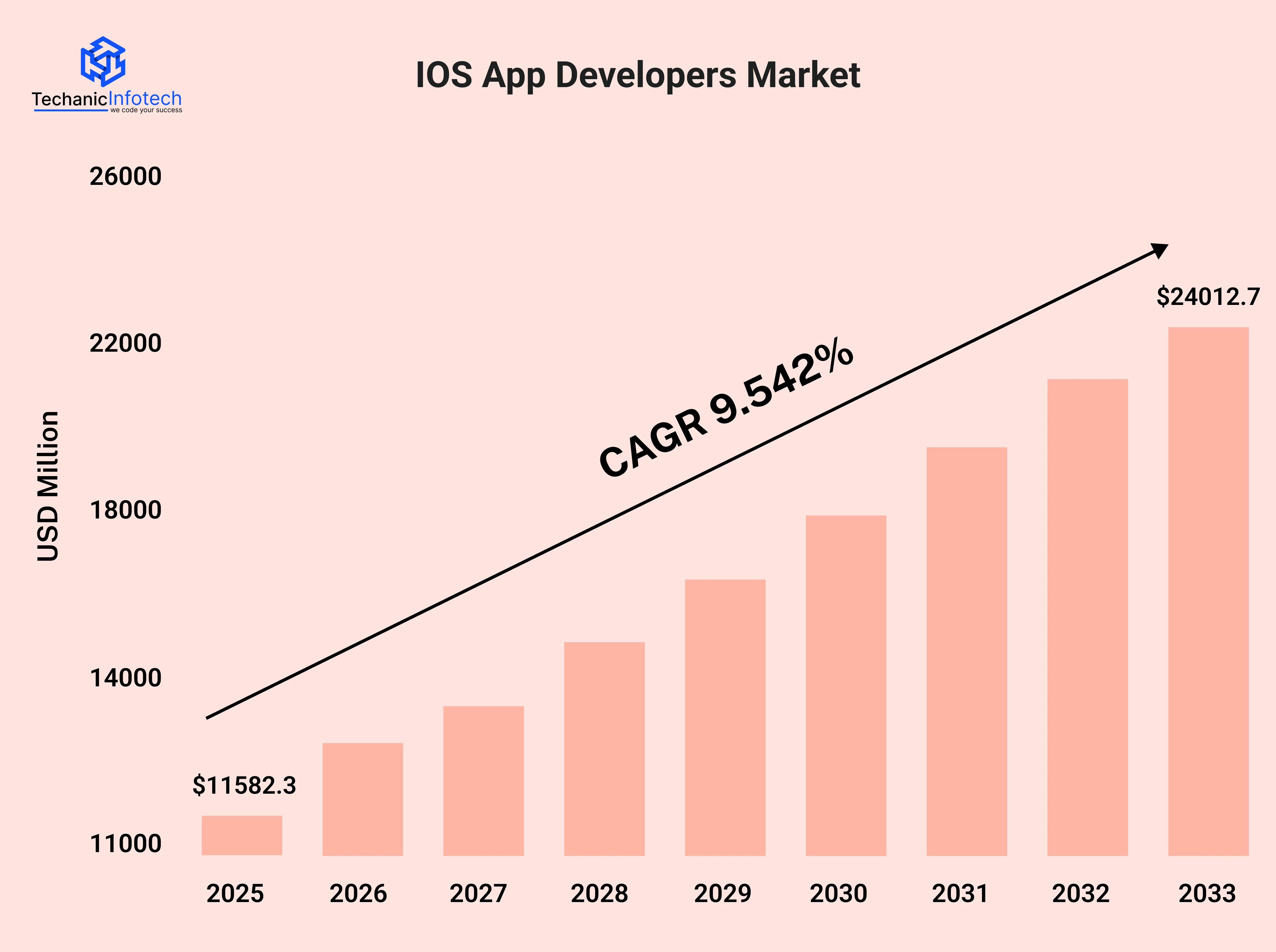 The iOS Developer Services market is expected to grow at a CAGR of 9.542% from 2025 to 2033.